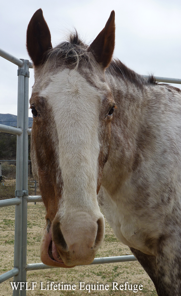 Arrow, a healthy16 year old Appy mare, that had been over worked in barrel racing.. was abandoned after she could no longer perform. We rescued Arrow from a good Samaritan who had tried to help her but fell on hard times. Thanks to the generous assistance of supporters like you - Arrow will now always know peace and harmony of safe surroundings. Arrow has arthritis in her rear legs and just needed a safe and loving place with a small pasture where she could live out her years. Arrow currently has an adopter pending through WFLF-LER.